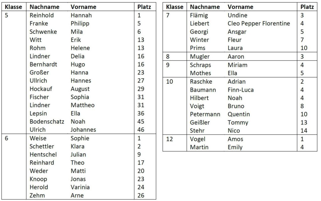 Nachdem wir letztes Jahr leider den Ma-Olympiaden-Pokal an das Gymnasium Waldenburg abgeben mussten, haben wir dieses Jahr wieder realistische Chancen, ihn uns zurückzuholen. Unsere Teilnehmer hatten die richtigen mathematischen Lösungsansätze und setzten sich in der 2. Stufe der Ma-Olympiade im Wettstreit mit den Gymnasien Glauchau, Lichtenstein, Limbach-Oberfrohna, Meerane und Waldenburg gegen ihre Konkurrenten durch. Das LGHE ist in allen Klassenstufen auf den vorderen Rängen dabei.